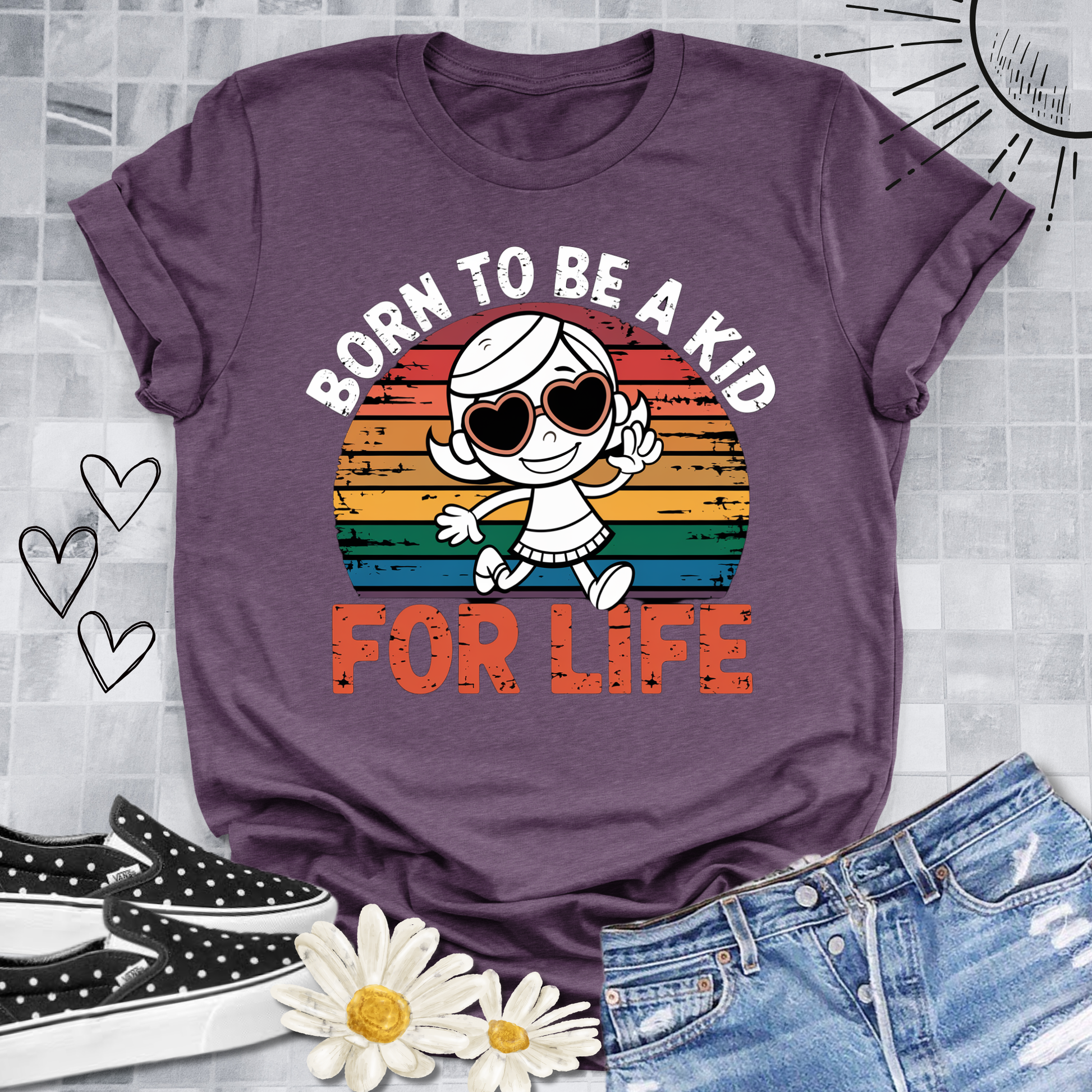 This “Born to Be a Kid for Life” design is a joyful reminder that growing older doesn’t mean growing dull. With its retro rainbow backdrop and heart-shaped sunglasses, it celebrates the timeless spirit of fun, freedom, and curiosity that lives inside us all.