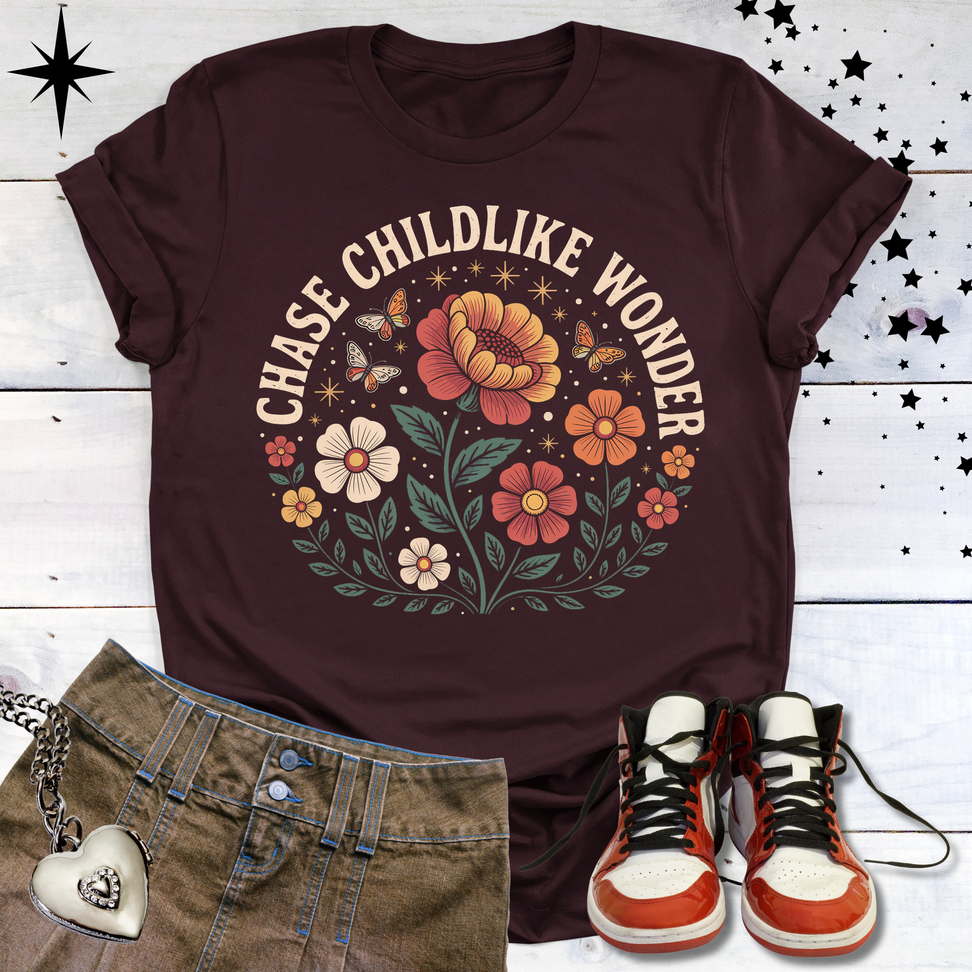 “Chase Childlike Wonder” is a gentle reminder to follow the spark that once made everything feel magical. With its arched lettering floating above blooming flowers and fluttering butterflies, this design captures the beauty, curiosity, and openhearted joy we knew as kids. Wearing it encourages your grown-up self to pause, breathe, and see the world with softer eyes—eyes that still believe in possibility, play, and simple delight.