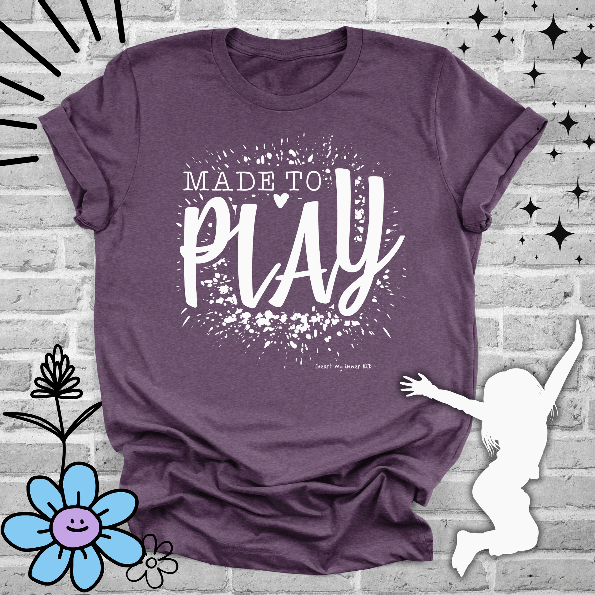 This “MADE TO PLAY” design bursts with energy, reminding us that joy and playfulness aren’t just for kids—they’re part of who we are at every age. The bold, lively lettering with playful splatter details captures the carefree spirit of childhood.