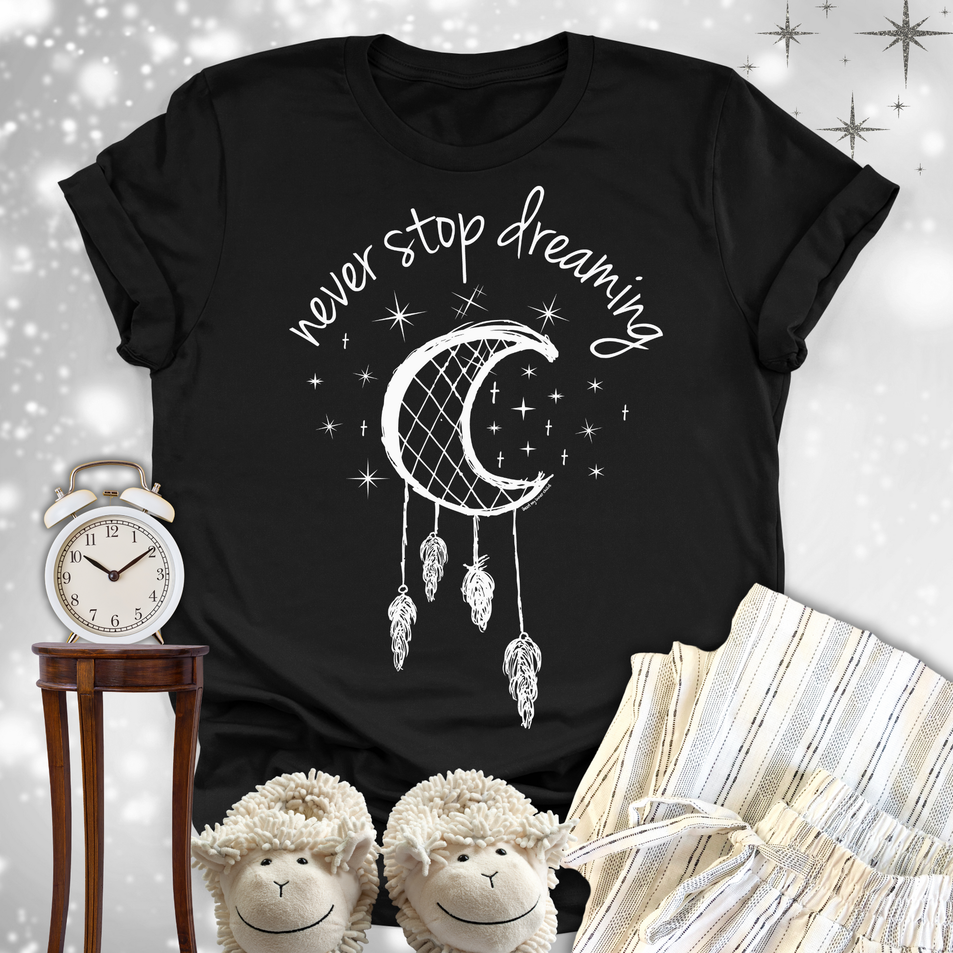 This “Never Stop Dreaming” design captures the magic of childhood wonder with its dreamy moon dream-catcher and sparkling stars. It’s a gentle reminder that the imagination, hope, and joy we carried as kids still live within us.
