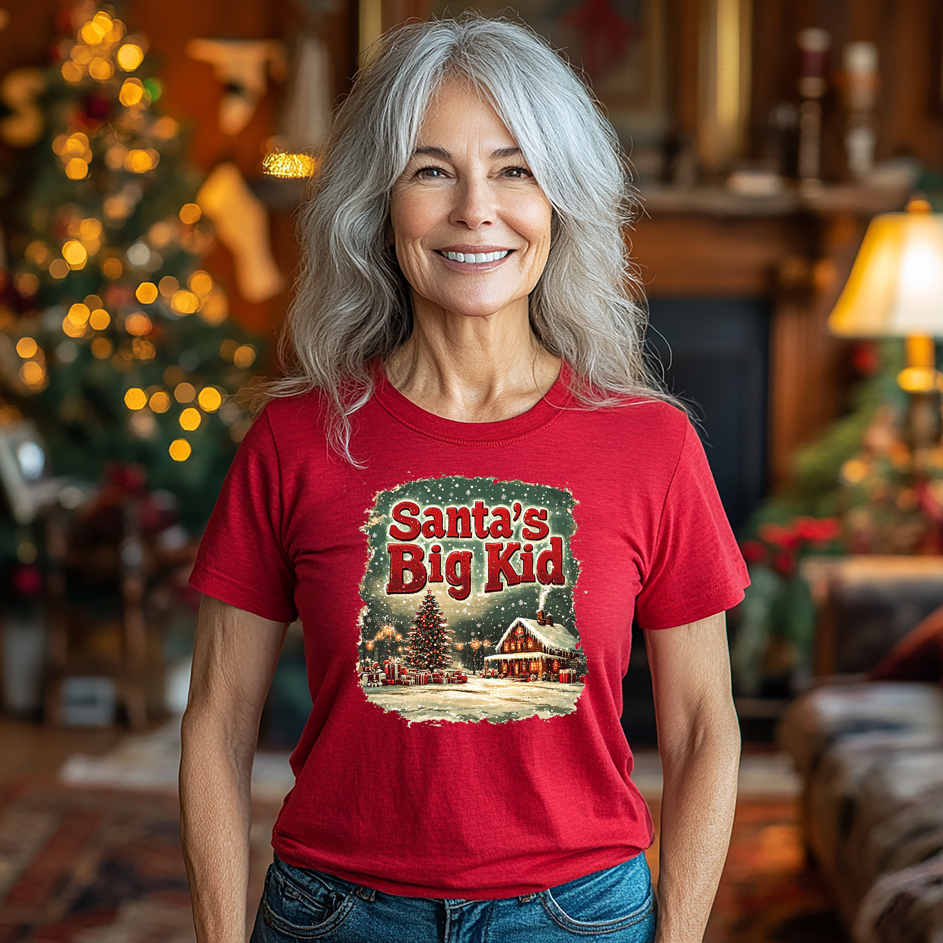 "Santa’s Big Kid" — This whimsical design captures the magic of Christmas through the eyes of someone who proudly holds onto their childlike wonder. With a cozy winter cabin, twinkling lights, and a festive tree, it reminds us that no matter how old we are, the holiday season has the power to awaken the joy and excitement of our inner child.