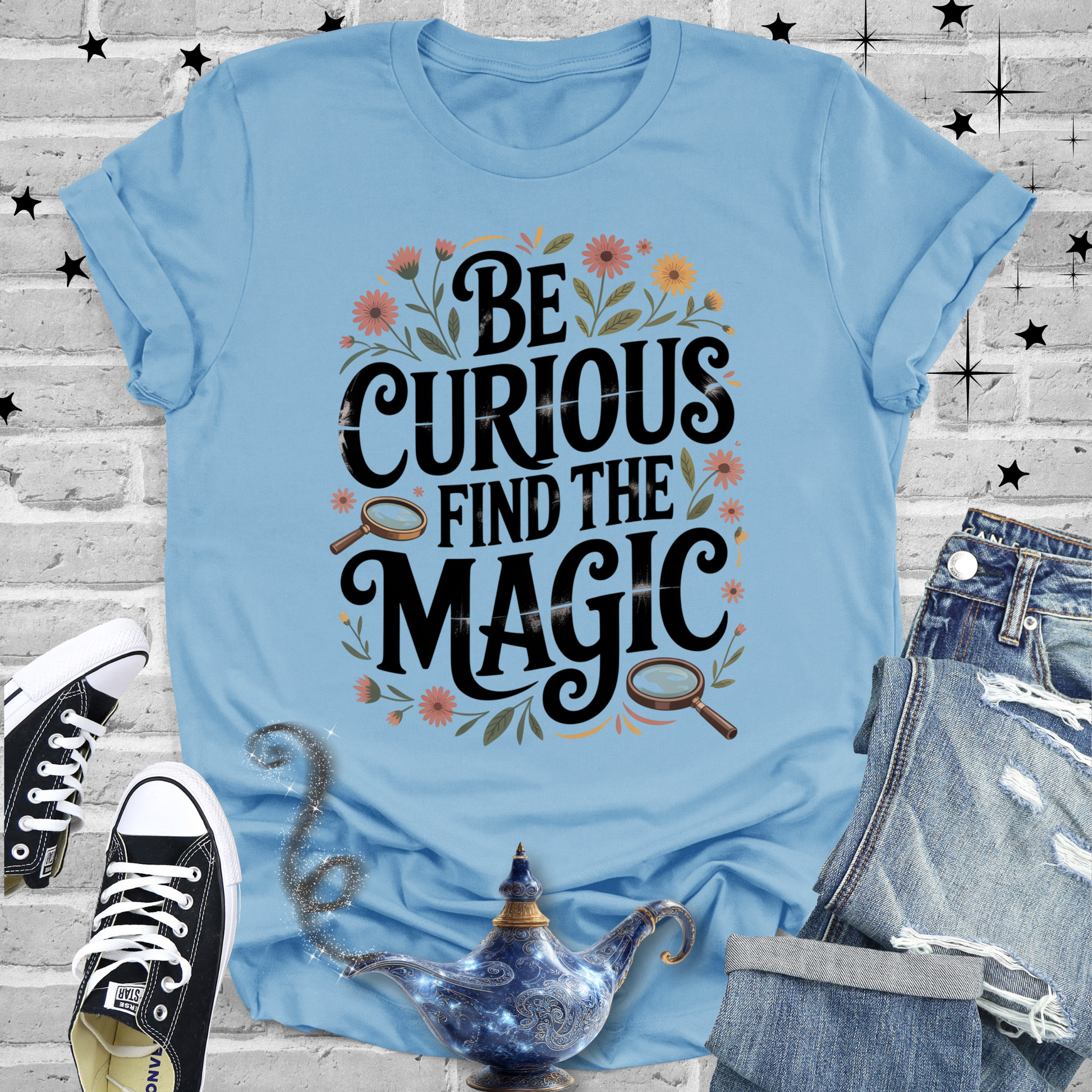 This “Be Curious, Find the Magic” design is a beautiful reminder that wonder still lives in the everyday—if we only pause to look. With its playful florals and magnifying glasses, it captures the spirit of childlike discovery and joy.